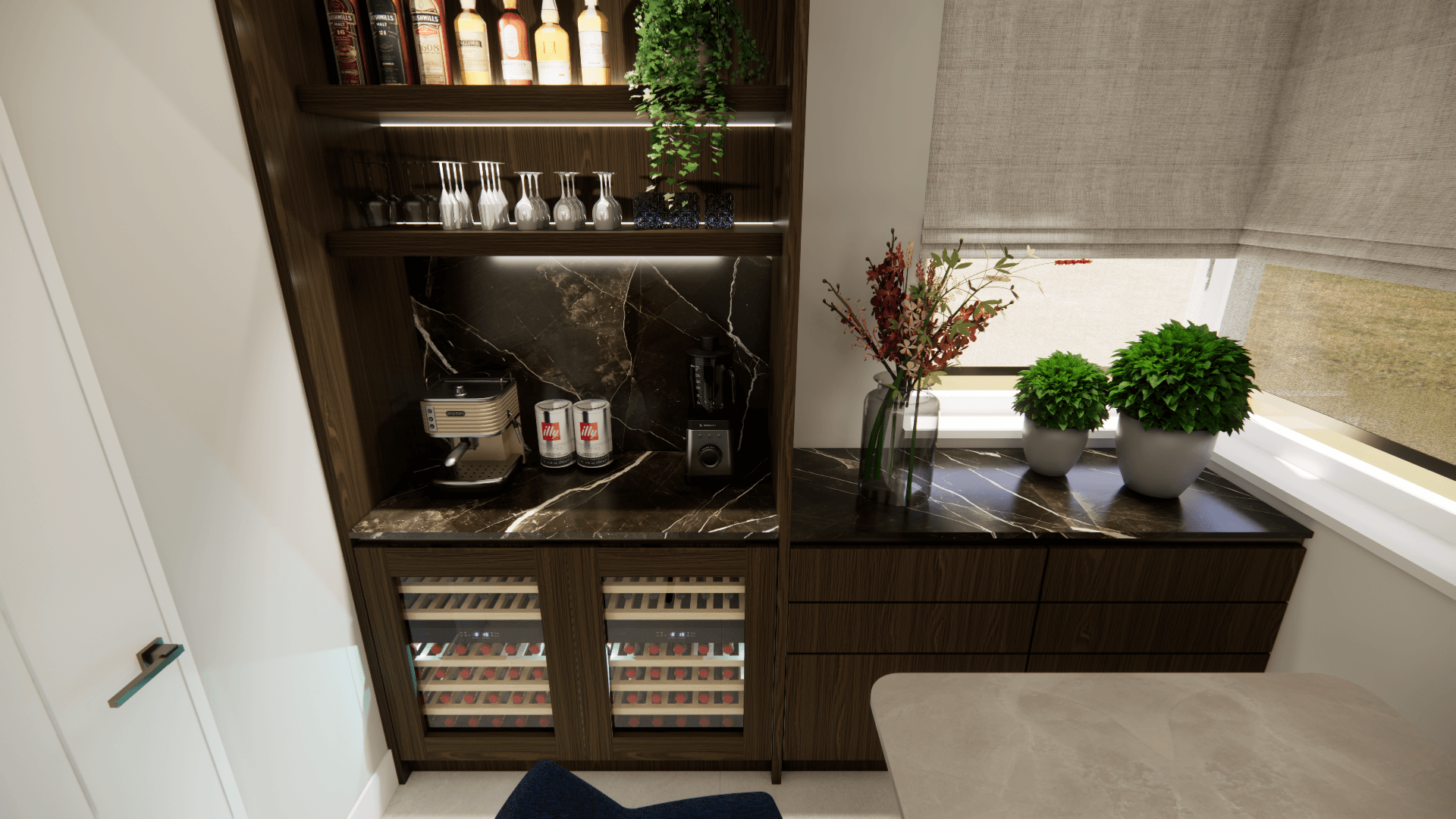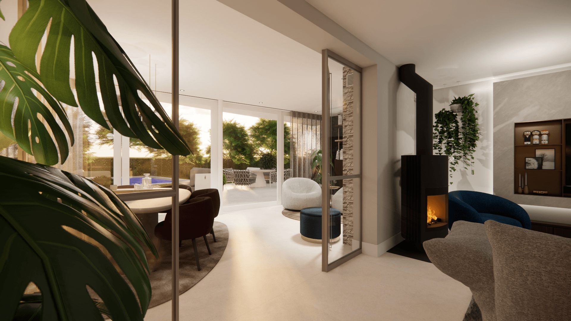 Voor deze jaren '90 woning hebben we de gehele begane grond onder handen genomen. Waarbij we ook de huidige tuinkamer een extra functie hebben gegeven. Deze is nu af te sluiten d.m.v. de stalen deuren in een bronskleur.