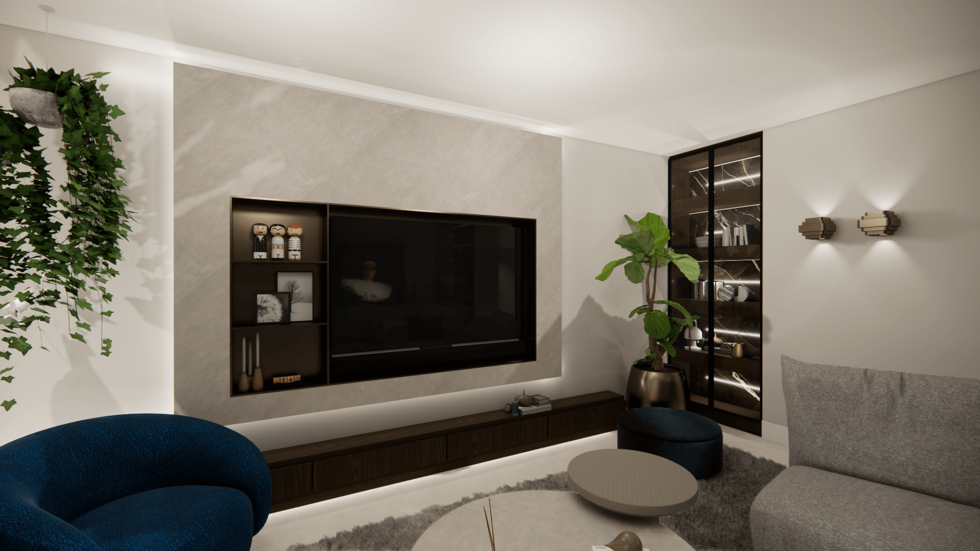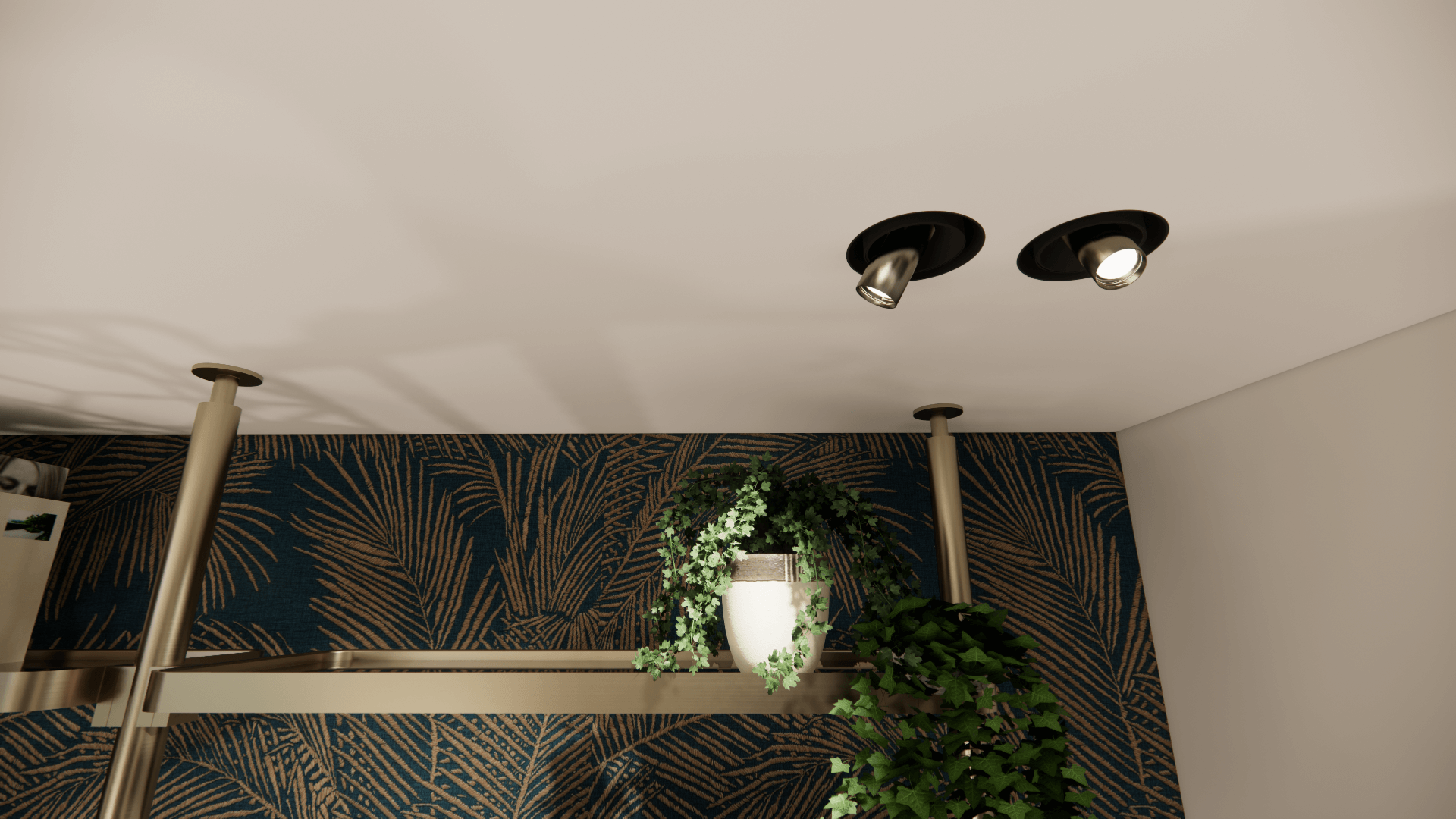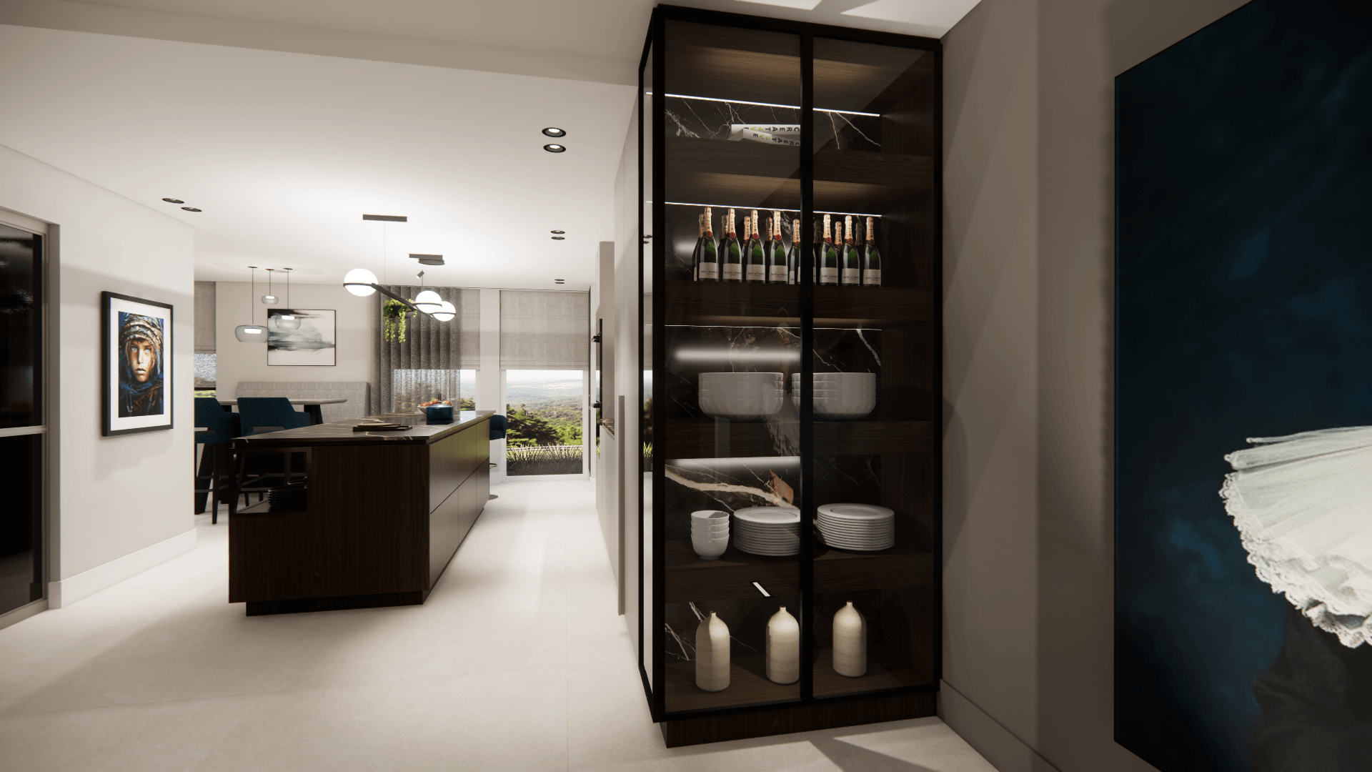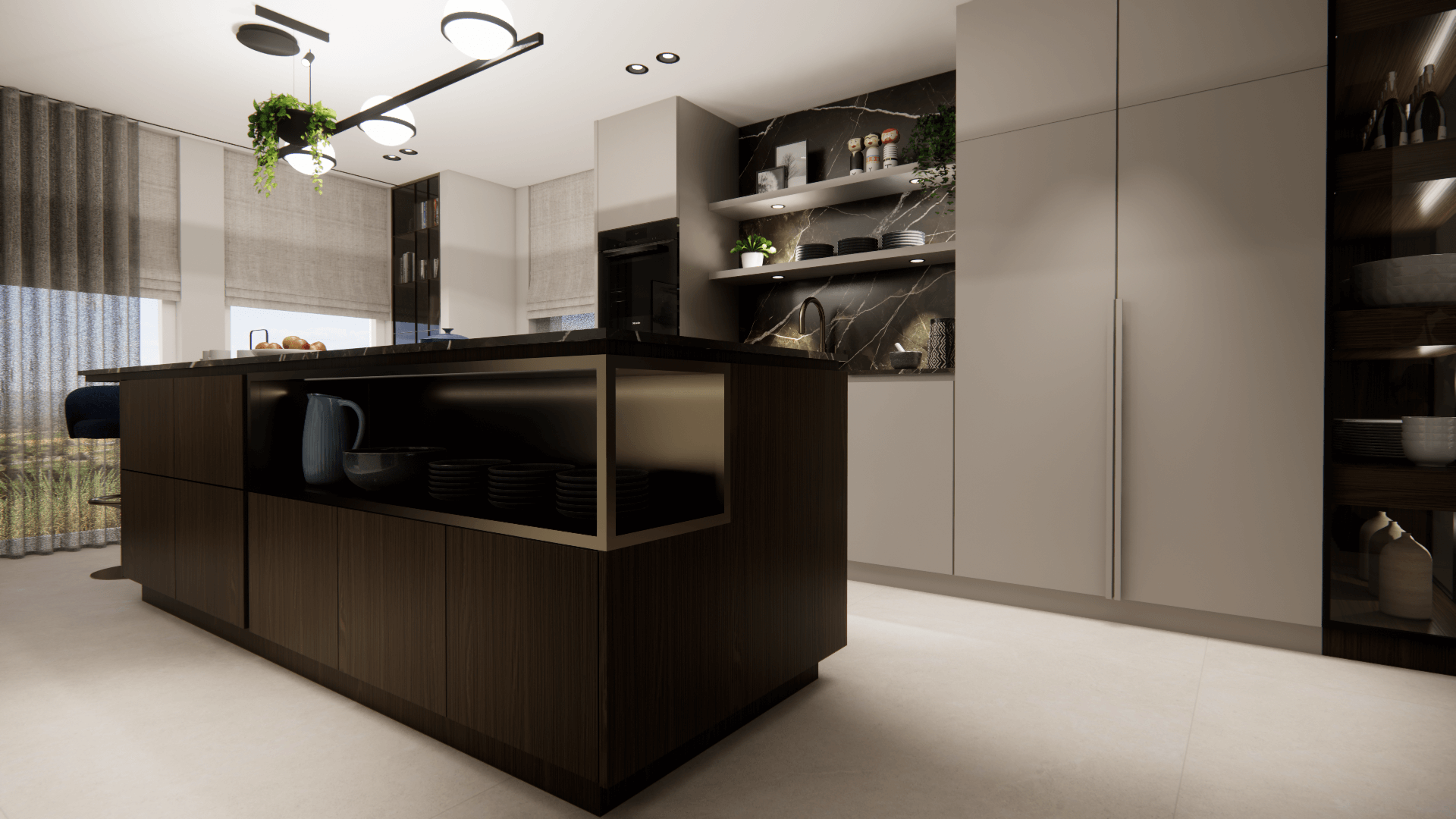 In de woning zijn diverse zichtlijnen dus wat mooie eyecatchers tegen de wanden zijn dan een 'must'. Daarin zit de kleur, alsmede in het behang in de tuinkamer. de rest van het interieur is gebaseerd op mooie zandkleuren gecombineerd met donker hout. De metallic accenten geven het geheel de extra glans die het verdiend..