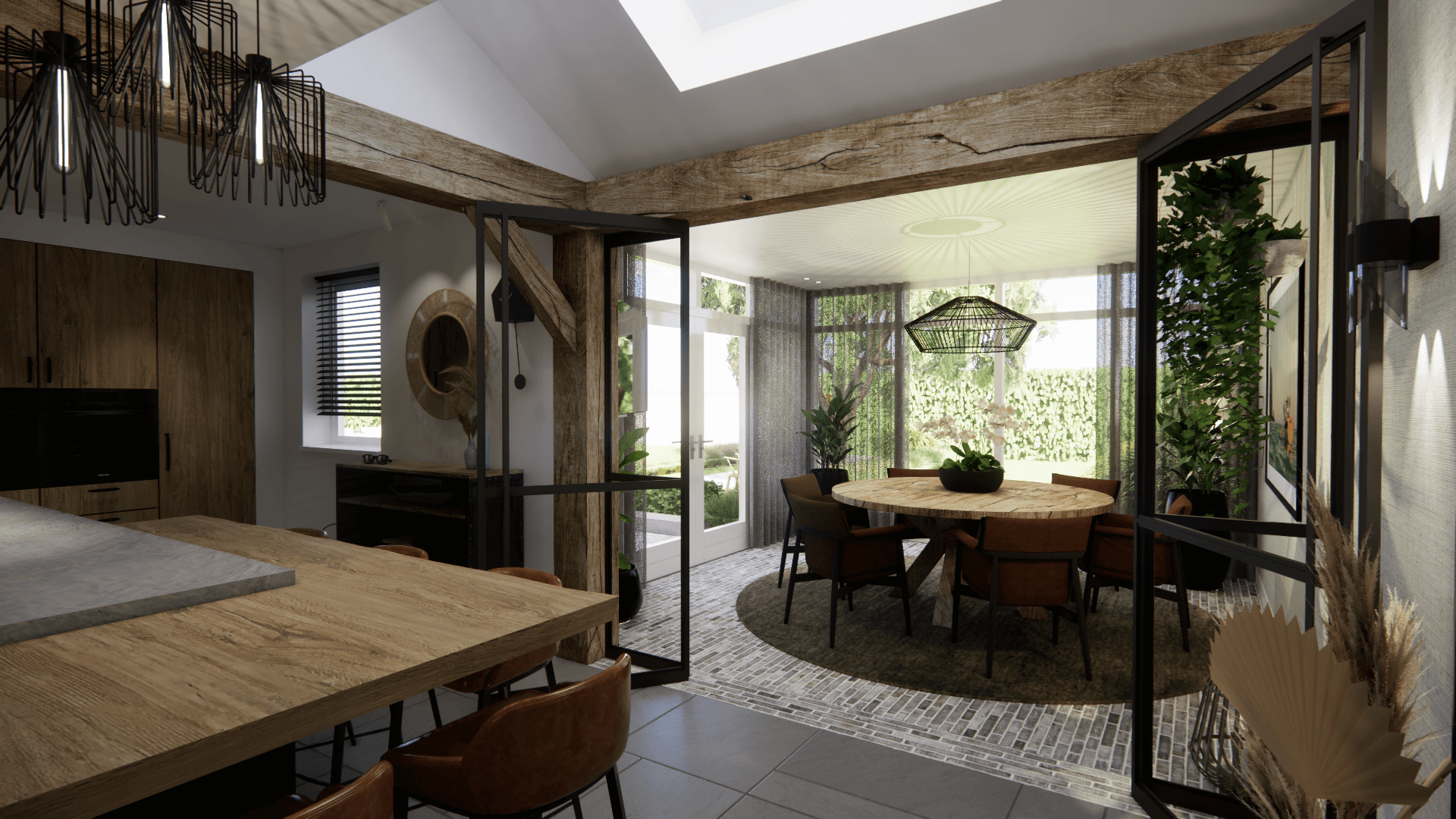 Voor de kenmerkende uitbouw hebben we gekozen voor ruwe eiken balken, dat is tevens de constructie. Afgewerkt met zwarte rabatdelen. En heel veel glas om zoveel mogelijk licht naar binnen, en zoveel mogelijk zicht naar buiten op de landerijen te creƫren.