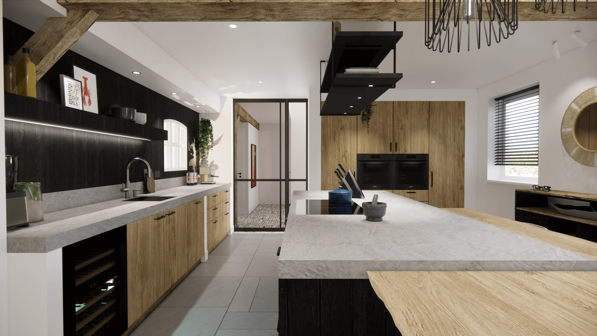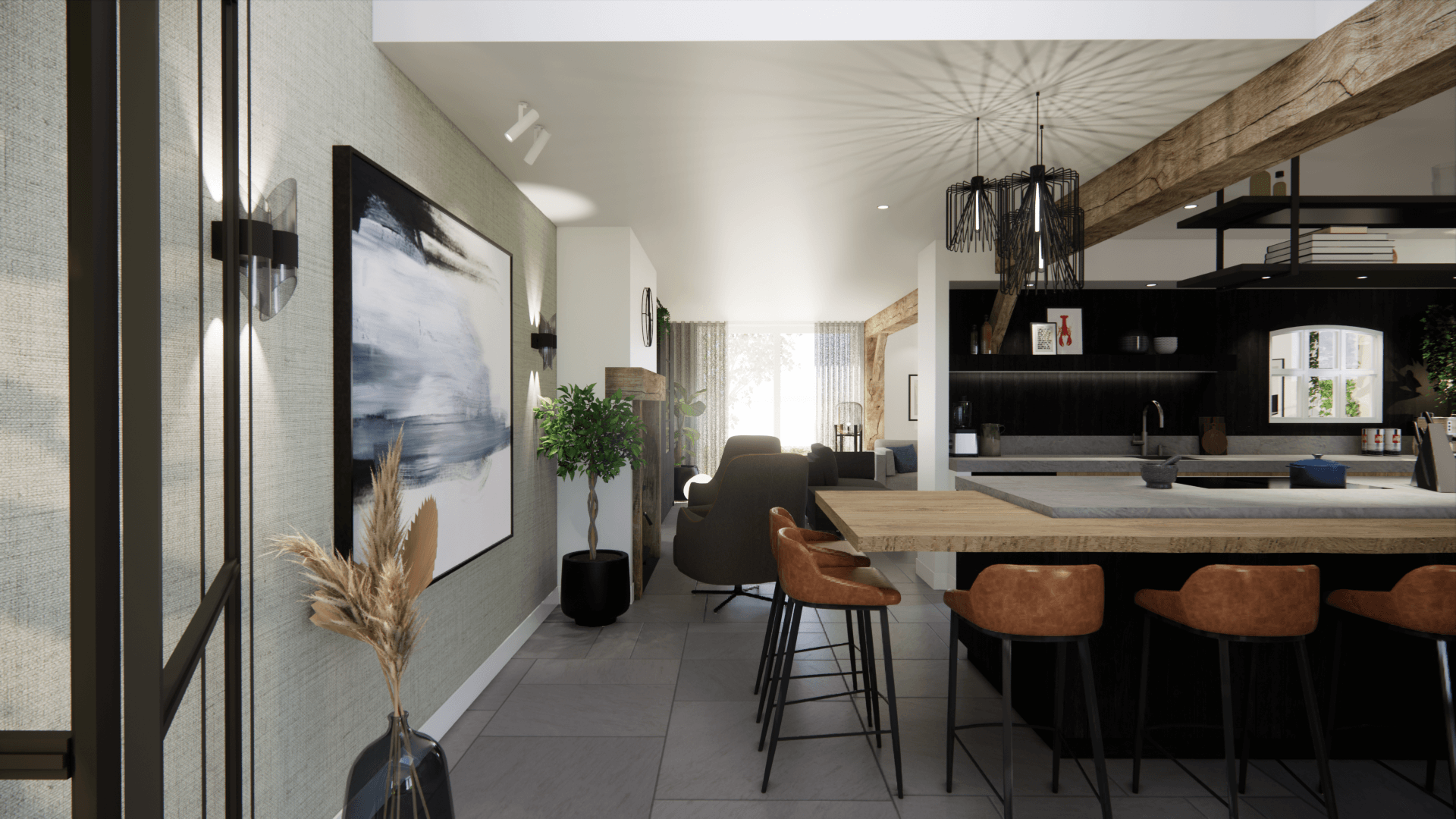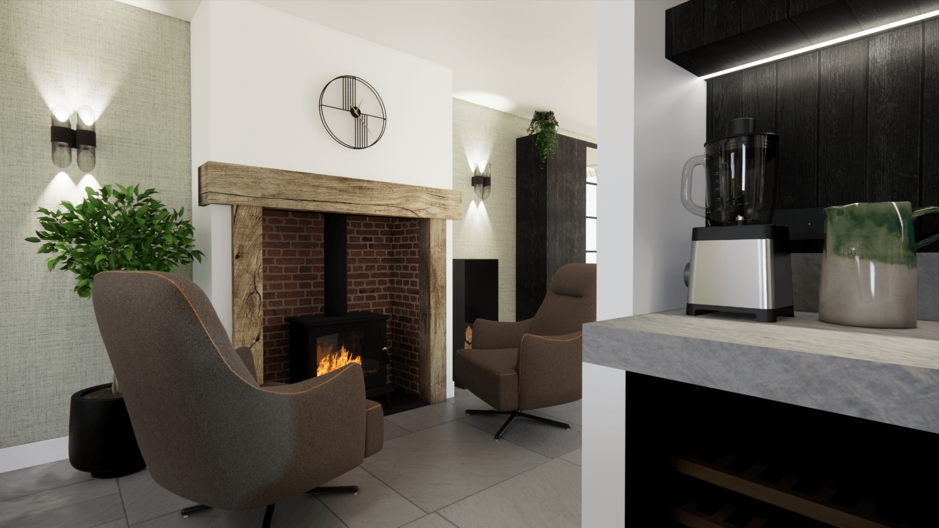 Veel hout, oude klinkers die doorlopen vanuit het terras de woning in, en lijnen die kloppen. Soms zelfs geaccentueerd door bijvoorbeeld de genoemde klinkers. Een oud halfrond stalraam dat we hergebruikt hebben in de nieuwe modern landelijke keuken. Met een zithoek die diep verscholen ligt, om een extra knusse hoek te krijgen. De oude schouw is het middelpunt van alle ruimtes.