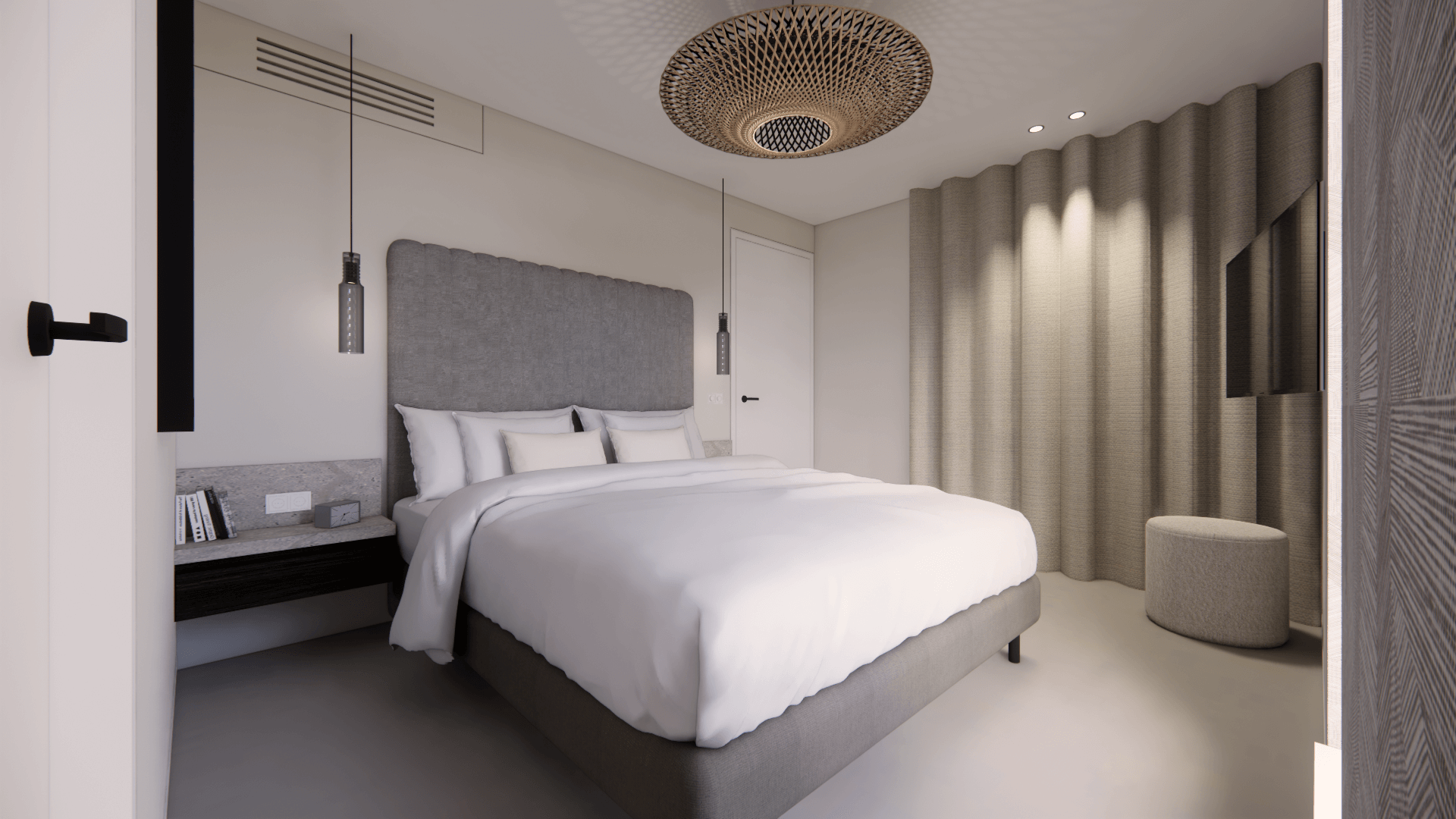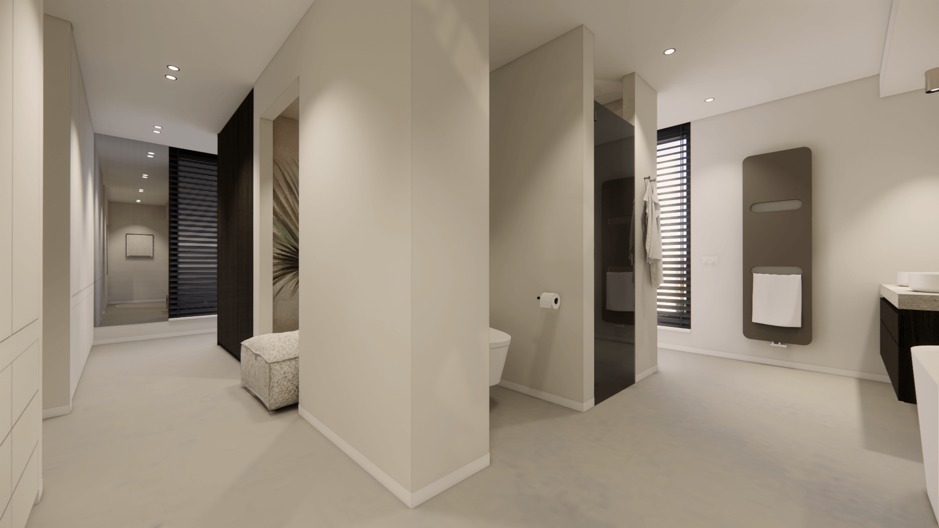 Een compleet nieuwe indeling, en interieur, voor dit appartement. helemaal afgestemd op de opdrachtgevers. Eén grote slaapzone, met ruime badkamer en multifunctionele inloopkast. De gietvloer in een lichte zandkleur verbindt alle ruimtes en maakt er een lichte oase van.